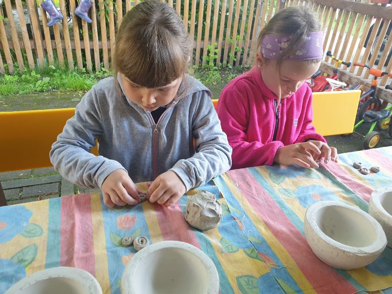 Tonarbeiten mit Kindern macht nicht nur jede Menge Spaß, sondern fördert auch die Kreativität. Beim Umgang mit Modelliermasse lernen Kinder, auf welch vielfältige Weise sich das Material verwenden lässt. Änne lässt die Kinder dabei verschiedene Techniken ausprobieren und auch Naturmaterial wie Blätter, Gräser und Blüten, die die Kinder selber gesammelt haben, werden in den Ton mit eingeformt.