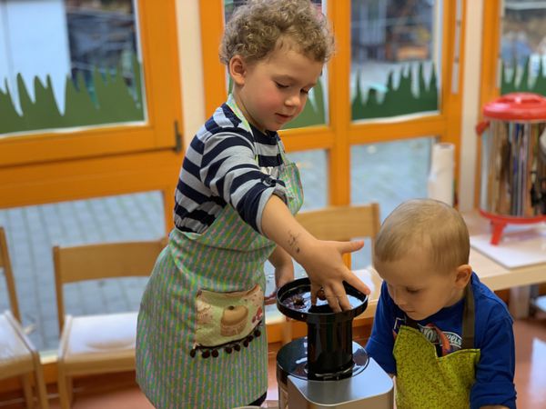 In unserem Kindergarten achten wir besonders auf eine gesunde und ausgewogene Ernährung. Dazu gehört z. B., dass das Frühstück und Vesper aus frischen Zutaten von unserer Hauswirtschafterin Frau Falk täglich frisch vor Ort zubereitet wird. Die Kinder lernen so bereits, wie man aus frischem Obst und Gemüse aus dem heimischen Garten einen leckeren Multivitaminsaft selbst herstellen kann.