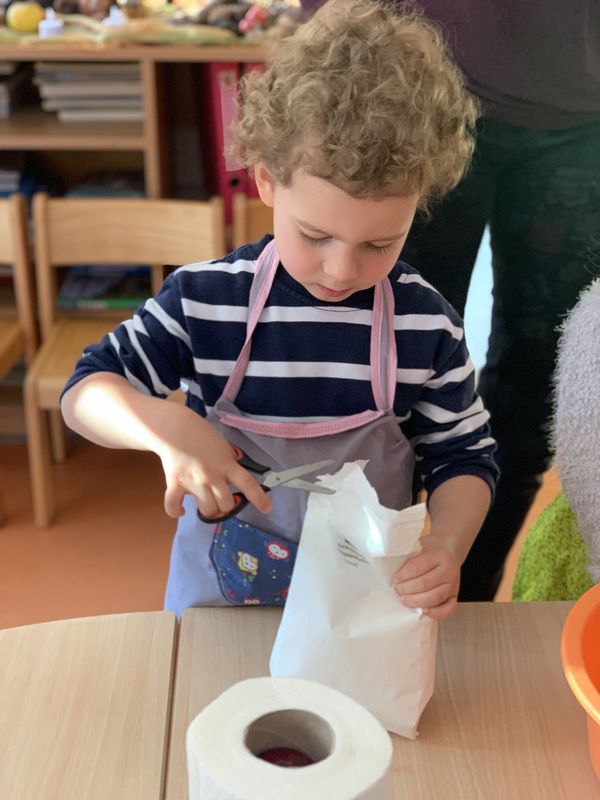 Freude am eigenständigen und auch exakten Arbeiten zu entwickeln, indem die Kinder die verschiedenen Arbeitsschritte zunächst beobachten konnten, um dann selbst nach einem eigenen Plan ihr “Formenmännlein“ zu gestalten.