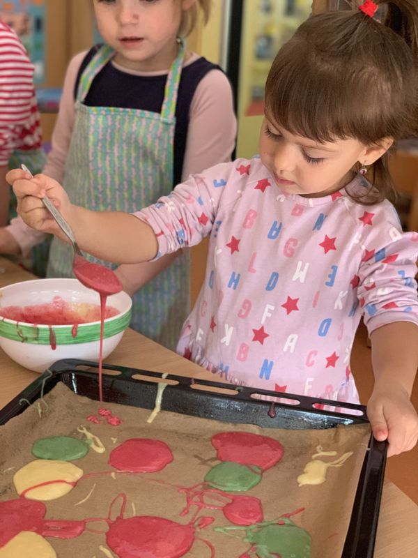 Also wurde gemeinsam überlegt, was man dafür alles braucht. Dann wurde gezählt, gewogen und abgemessen und alles in einer großen Schüssel zusammengerührt. Zum Schluss wurde die Knete in Portionen aufgeteilt und noch eingefärbt. Selbst Glitzerpulver kam zum Einsatz. Nun konnte endlich geknetet und geformt werden.