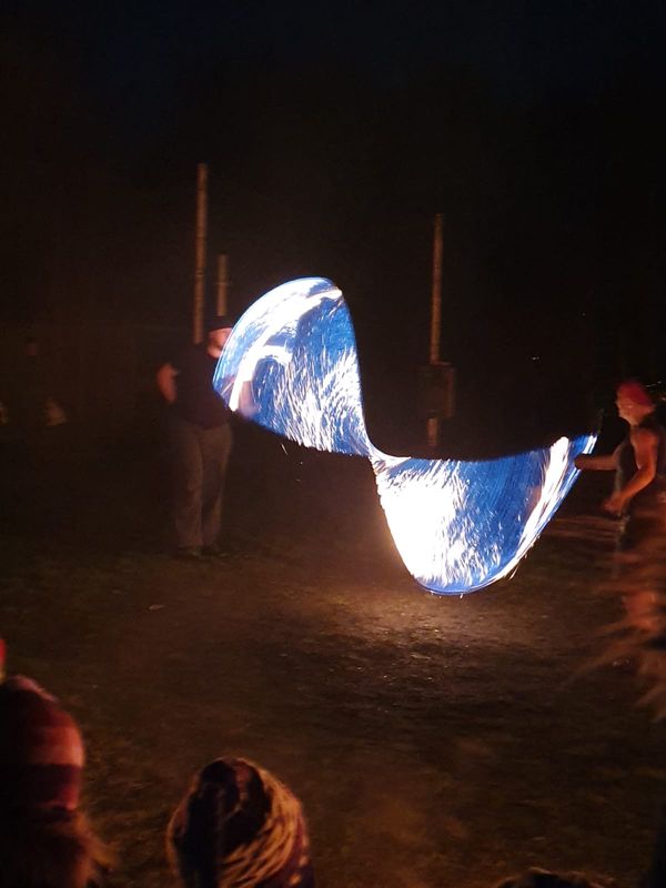 Als es bereits dunkel geworden war, erwartete uns dann noch ein Highlight! Eine Feuershow mit Jana Linnbach und ihrer Crew. Mit großen, leuchtenden Augen saßen die Kinder da und staunten, mit welcher Leichtigkeit zu Musik mit dem Feuer getanzt wurde. Große Feuerfontänen erleuchteten immer wieder den Abendhimmel.