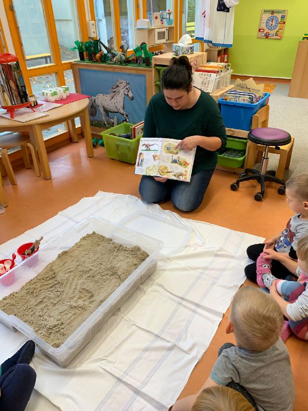 Alle Kinder waren voller Eifer dabei, sei es die Knochenausgrabung oder selbst einen Dinosaurier zu basteln. Als krönenden Abschluss feierten wir eine Dino-Party mit allem was dazugehört: Ein Dinofrühstück, Dinoeiereierlauf oder der Vulkanausbruch. Voller Erstaunen stellten unsere angehenden Dinoforscher zudem fest, wie groß doch so ein Dinosaurier, beziehungsweise dessen Fuß, im Vergleich zu ihnen ist!